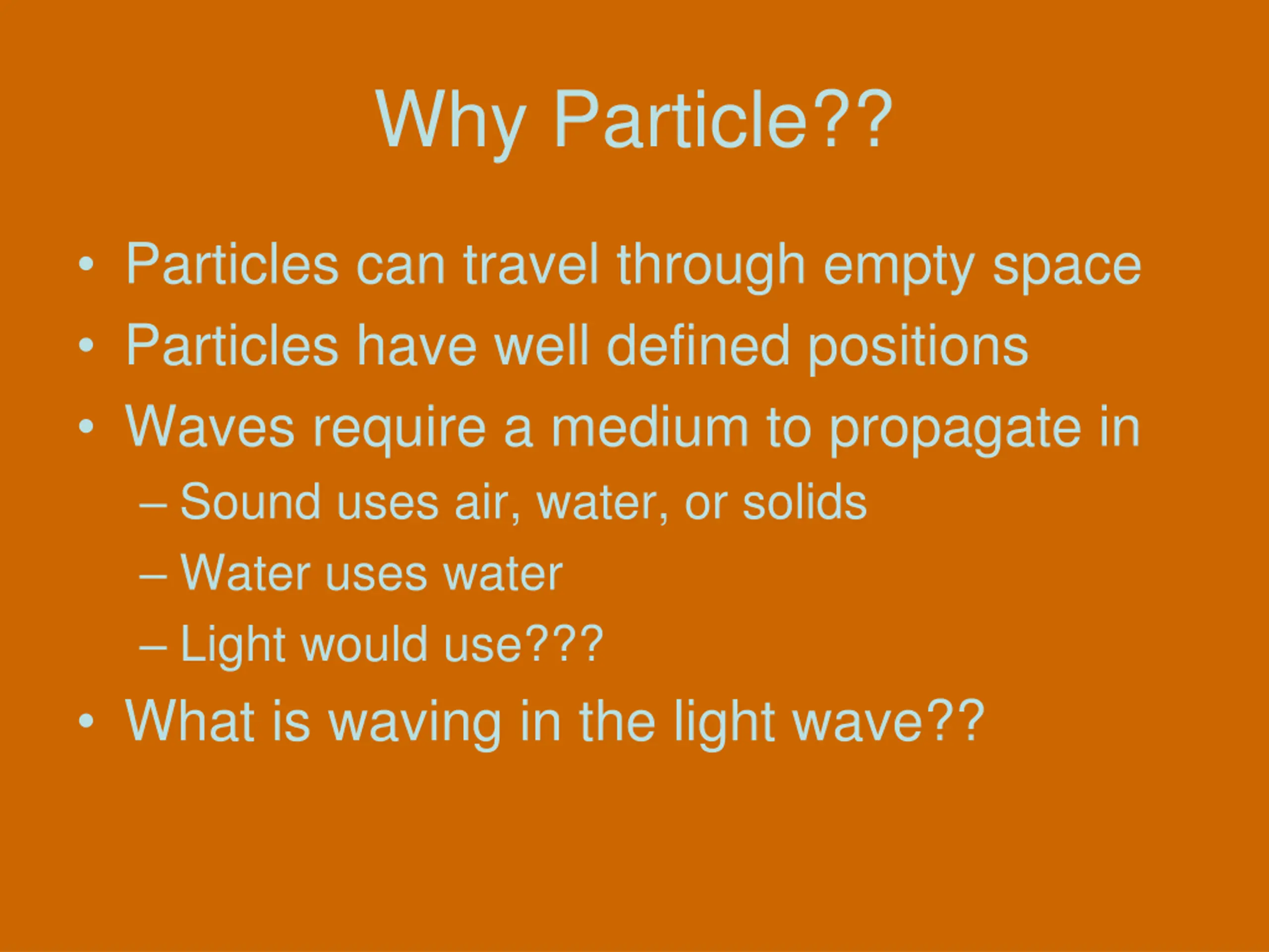 Why Particle?? • Particles can travel through empty space • Particles have well defined positions • Waves require a medium to propagate in – Sound uses air, water, or solids – Water uses water – Light would use??? • What is waving in the light wave??