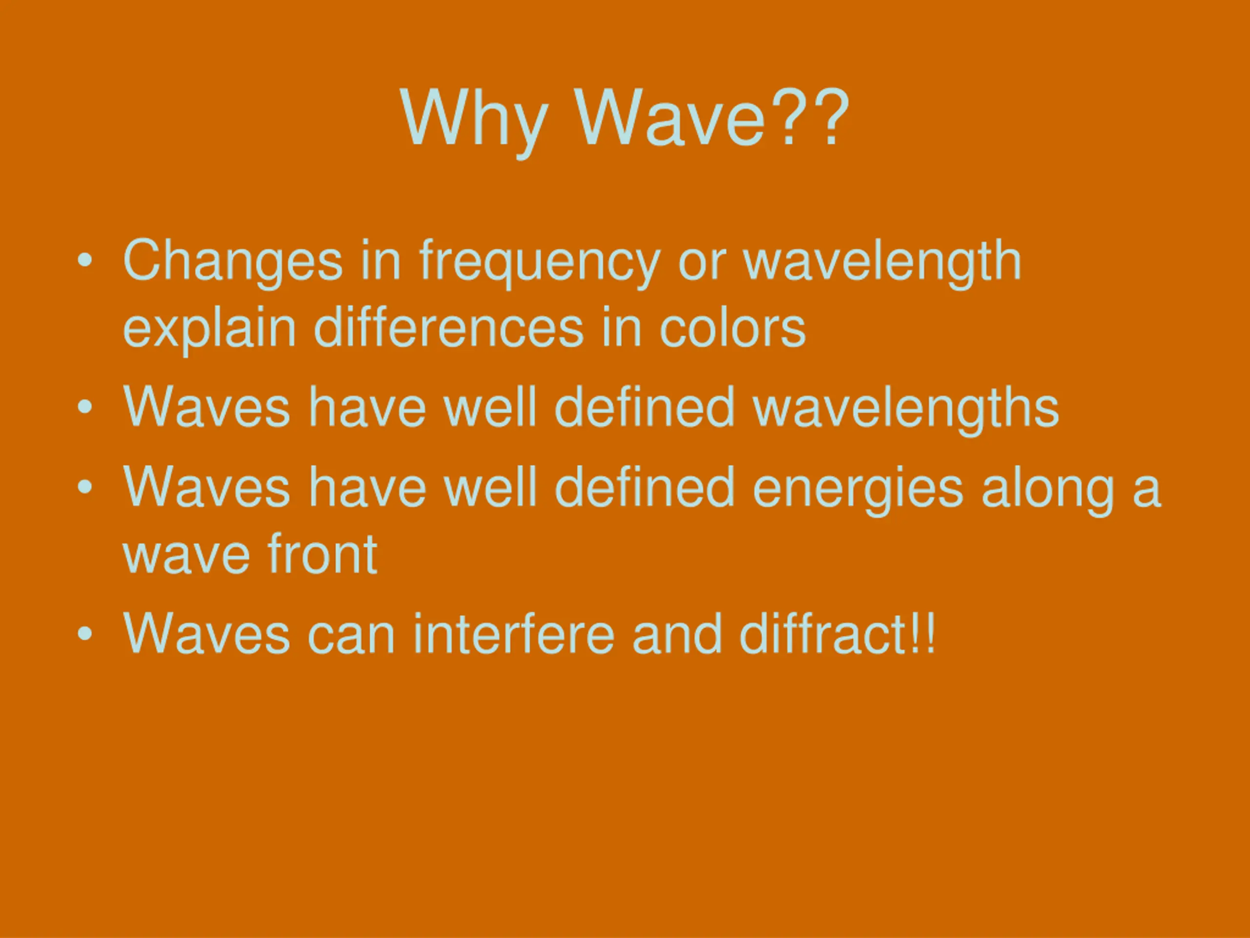 Why Wave?? • Changes in frequency or wavelength explain differences in colors • Waves have well defined wavelengths • Waves have well defined energies along a wave front • Waves can interfere and diffract!!