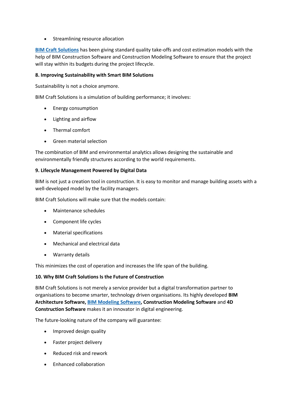 • Streamlining resource allocation BIM Craft Solutions has been giving standard quality take-offs and cost estimation models with the help of BIM Construction Software and Construction Modeling Software to ensure that the project will stay within its budgets during the project lifecycle. 8. Improving Sustainability with Smart BIM Solutions Sustainability is not a choice anymore. BIM Craft Solutions is a simulation of building performance; it involves: • Energy consumption • Lighting and airflow • Thermal comfort • Green material selection The combination of BIM and environmental analytics allows designing the sustainable and environmentally friendly structures according to the world requirements. 9. Lifecycle Management Powered by Digital Data BIM is not just a creation tool in construction. It is easy to monitor and manage building assets with a well-developed model by the facility managers. BIM Craft Solutions will make sure that the models contain: • Maintenance schedules • Component life cycles • Material specifications • Mechanical and electrical data • Warranty details This minimizes the cost of operation and increases the life span of the building. 10. Why BIM Craft Solutions Is the Future of Construction BIM Craft Solutions is not merely a service provider but a digital transformation partner to organisations to become smarter, technology driven organisations. Its highly developed BIM Architecture Software, BIM Modeling Software, Construction Modeling Software and 4D Construction Software makes it an innovator in digital engineering. The future-looking nature of the company will guarantee: • Improved design quality • Faster project delivery • Reduced risk and rework • Enhanced collaboration