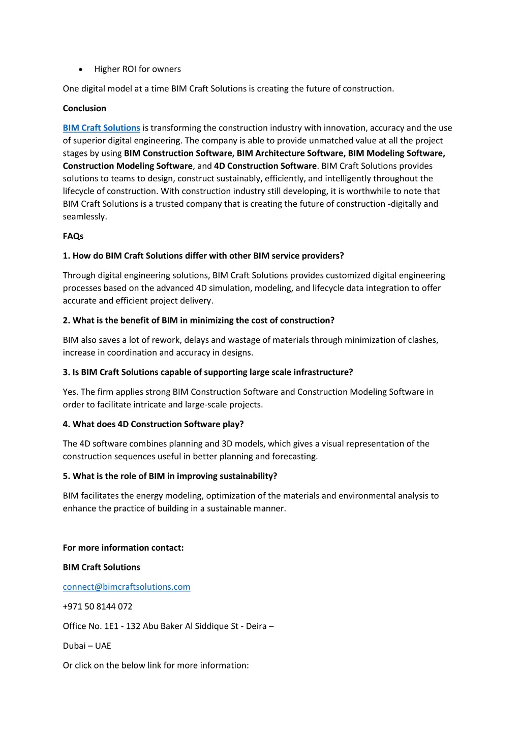 • Higher ROI for owners One digital model at a time BIM Craft Solutions is creating the future of construction. Conclusion BIM Craft Solutions is transforming the construction industry with innovation, accuracy and the use of superior digital engineering. The company is able to provide unmatched value at all the project stages by using BIM Construction Software, BIM Architecture Software, BIM Modeling Software, Construction Modeling Software, and 4D Construction Software. BIM Craft Solutions provides solutions to teams to design, construct sustainably, efficiently, and intelligently throughout the lifecycle of construction. With construction industry still developing, it is worthwhile to note that BIM Craft Solutions is a trusted company that is creating the future of construction -digitally and seamlessly. FAQs 1. How do BIM Craft Solutions differ with other BIM service providers? Through digital engineering solutions, BIM Craft Solutions provides customized digital engineering processes based on the advanced 4D simulation, modeling, and lifecycle data integration to offer accurate and efficient project delivery. 2. What is the benefit of BIM in minimizing the cost of construction? BIM also saves a lot of rework, delays and wastage of materials through minimization of clashes, increase in coordination and accuracy in designs. 3. Is BIM Craft Solutions capable of supporting large scale infrastructure? Yes. The firm applies strong BIM Construction Software and Construction Modeling Software in order to facilitate intricate and large-scale projects. 4. What does 4D Construction Software play? The 4D software combines planning and 3D models, which gives a visual representation of the construction sequences useful in better planning and forecasting. 5. What is the role of BIM in improving sustainability? BIM facilitates the energy modeling, optimization of the materials and environmental analysis to enhance the practice of building in a sustainable manner. For more information contact: BIM Craft Solutions connect@bimcraftsolutions.com +971 50 8144 072 Office No. 1E1 - 132 Abu Baker Al Siddique St - Deira – Dubai – UAE Or click on the below link for more information: