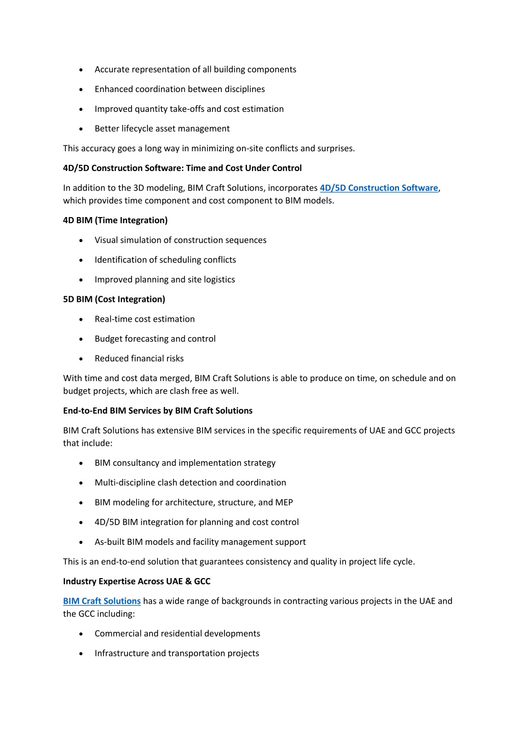 • Accurate representation of all building components • Enhanced coordination between disciplines • Improved quantity take-offs and cost estimation • Better lifecycle asset management This accuracy goes a long way in minimizing on-site conflicts and surprises. 4D/5D Construction Software: Time and Cost Under Control In addition to the 3D modeling, BIM Craft Solutions, incorporates 4D/5D Construction Software, which provides time component and cost component to BIM models. 4D BIM (Time Integration) • Visual simulation of construction sequences • Identification of scheduling conflicts • Improved planning and site logistics 5D BIM (Cost Integration) • Real-time cost estimation • Budget forecasting and control • Reduced financial risks With time and cost data merged, BIM Craft Solutions is able to produce on time, on schedule and on budget projects, which are clash free as well. End-to-End BIM Services by BIM Craft Solutions BIM Craft Solutions has extensive BIM services in the specific requirements of UAE and GCC projects that include: • BIM consultancy and implementation strategy • Multi-discipline clash detection and coordination • BIM modeling for architecture, structure, and MEP • 4D/5D BIM integration for planning and cost control • As-built BIM models and facility management support This is an end-to-end solution that guarantees consistency and quality in project life cycle. Industry Expertise Across UAE & GCC BIM Craft Solutions has a wide range of backgrounds in contracting various projects in the UAE and the GCC including: • Commercial and residential developments • Infrastructure and transportation projects