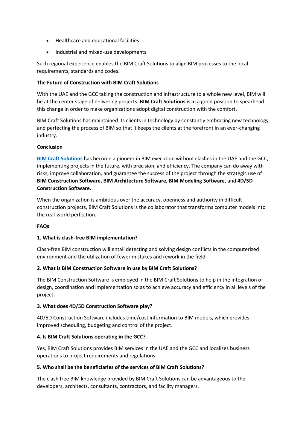 • Healthcare and educational facilities • Industrial and mixed-use developments Such regional experience enables the BIM Craft Solutions to align BIM processes to the local requirements, standards and codes. The Future of Construction with BIM Craft Solutions With the UAE and the GCC taking the construction and infrastructure to a whole new level, BIM will be at the center stage of delivering projects. BIM Craft Solutions is in a good position to spearhead this change in order to make organizations adopt digital construction with the comfort. BIM Craft Solutions has maintained its clients in technology by constantly embracing new technology and perfecting the process of BIM so that it keeps the clients at the forefront in an ever-changing industry. Conclusion BIM Craft Solutions has become a pioneer in BIM execution without clashes in the UAE and the GCC, implementing projects in the future, with precision, and efficiency. The company can do away with risks, improve collaboration, and guarantee the success of the project through the strategic use of BIM Construction Software, BIM Architecture Software, BIM Modeling Software, and 4D/5D Construction Software. When the organization is ambitious over the accuracy, openness and authority in difficult construction projects, BIM Craft Solutions is the collaborator that transforms computer models into the real-world perfection. FAQs 1. What is clash-free BIM implementation? Clash-free BIM construction will entail detecting and solving design conflicts in the computerized environment and the utilization of fewer mistakes and rework in the field. 2. What is BIM Construction Software in use by BIM Craft Solutions? The BIM Construction Software is employed in the BIM Craft Solutions to help in the integration of design, coordination and implementation so as to achieve accuracy and efficiency in all levels of the project. 3. What does 4D/5D Construction Software play? 4D/5D Construction Software includes time/cost information to BIM models, which provides improved scheduling, budgeting and control of the project. 4. Is BIM Craft Solutions operating in the GCC? Yes, BIM Craft Solutions provides BIM services in the UAE and the GCC and localizes business operations to project requirements and regulations. 5. Who shall be the beneficiaries of the services of BIM Craft Solutions? The clash free BIM knowledge provided by BIM Craft Solutions can be advantageous to the developers, architects, consultants, contractors, and facility managers.