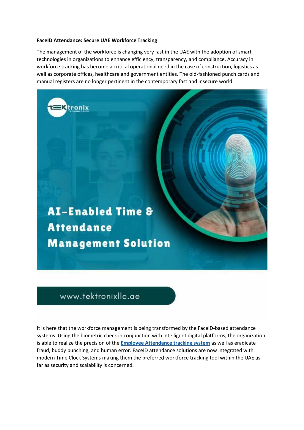 This paper will discuss the role that FaceID attendance will play in the future of workforce management in the UAE through RFID Time Attendance, Cloud-based Attendance, GPS Someone Time Tracking and advanced Time and Attendance Software. The Need for Secure Workforce Tracking in the UAE The UAE labor force is multicultural, mobile, and it is frequently distributed at several locations. The particular problems related to the construction industry, facilities management, oil and gas, and logistics concern the difficulty of keeping an accurate attendance record. Common challenges include: • Workforce mobility across sites • Manual errors in attendance records • Time theft and buddy punching • Compliance with labor regulations FaceID attendance systems can solve these problems by providing reliable, automatic, and real-time Employee Attendance. What Is FaceID Attendance? The FaceID attendance is a facial recognition technology that recognizes employees and automatically logs their attendance. It is not based on cards and PINs, as well as physical contact, unlike traditional systems. When integrated with modern Time Clock Systems, FaceID attendance ensures: • Contactless check-in and check-out • High accuracy and identity verification • Faster attendance processing • Reduced administrative workload This suits it best in the UAE workplaces where security, hygiene and efficiency are given priority. Time Clock Systems Reinvented with FaceID The Time Clock Systems in the modern world are not basic punch-in tools. They are smart workforce tracking tools with the FaceID technology. Advanced Time Clock Systems offer: • Facial recognition-based authentication • Real-time data synchronization • Integration with payroll and HR platforms • Multi-location support These systems provide these organizations of the UAE that have multiple branches or project sites with uniform and reliable monitoring of Employee attendance.