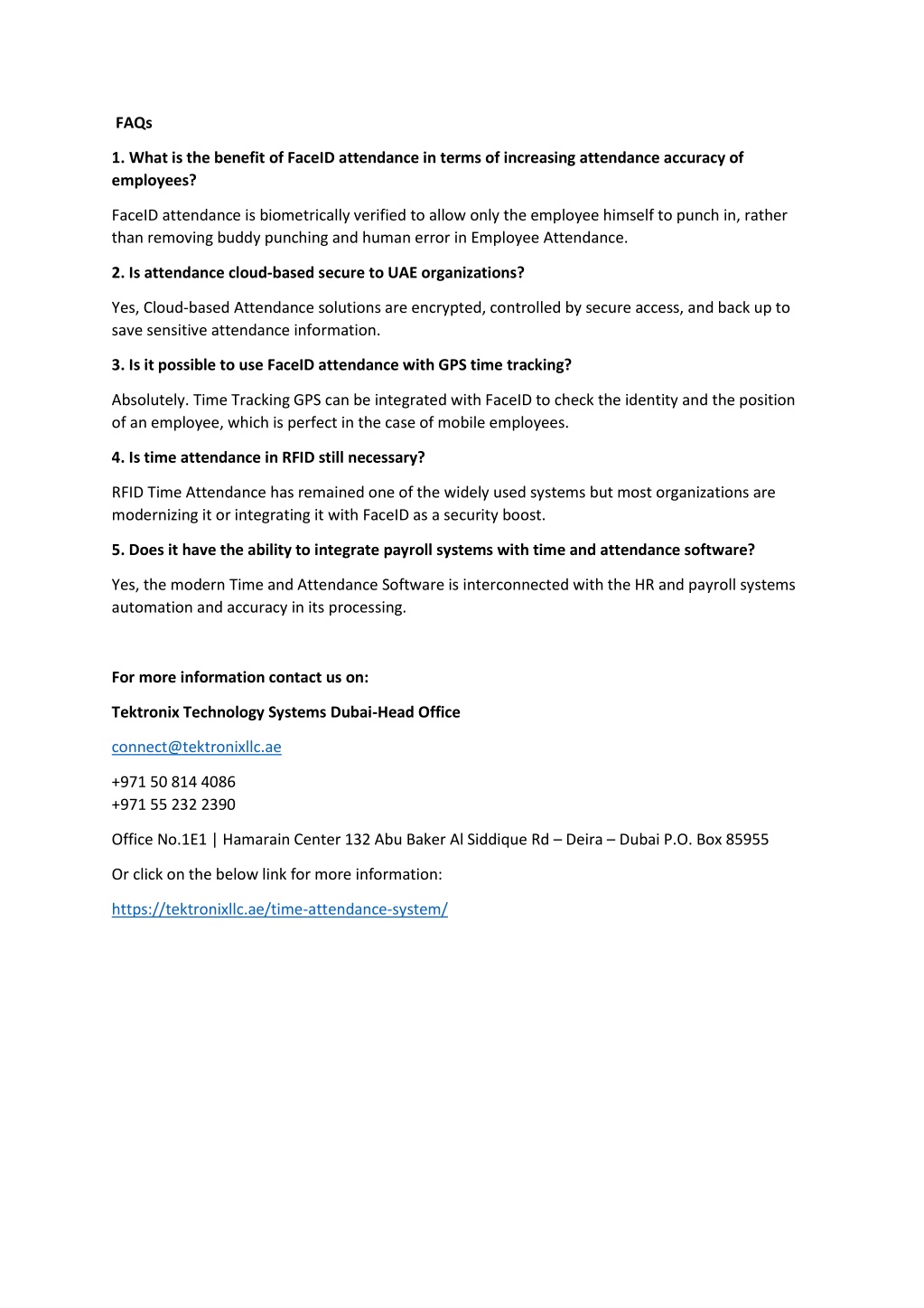 FAQs 1. What is the benefit of FaceID attendance in terms of increasing attendance accuracy of employees? FaceID attendance is biometrically verified to allow only the employee himself to punch in, rather than removing buddy punching and human error in Employee Attendance. 2. Is attendance cloud-based secure to UAE organizations? Yes, Cloud-based Attendance solutions are encrypted, controlled by secure access, and back up to save sensitive attendance information. 3. Is it possible to use FaceID attendance with GPS time tracking? Absolutely. Time Tracking GPS can be integrated with FaceID to check the identity and the position of an employee, which is perfect in the case of mobile employees. 4. Is time attendance in RFID still necessary? RFID Time Attendance has remained one of the widely used systems but most organizations are modernizing it or integrating it with FaceID as a security boost. 5. Does it have the ability to integrate payroll systems with time and attendance software? Yes, the modern Time and Attendance Software is interconnected with the HR and payroll systems automation and accuracy in its processing. For more information contact us on: Tektronix Technology Systems Dubai-Head Office connect@tektronixllc.ae +971 50 814 4086 +971 55 232 2390 Office No.1E1 | Hamarain Center 132 Abu Baker Al Siddique Rd – Deira – Dubai P.O. Box 85955 Or click on the below link for more information: https://tektronixllc.ae/time-attendance-system/