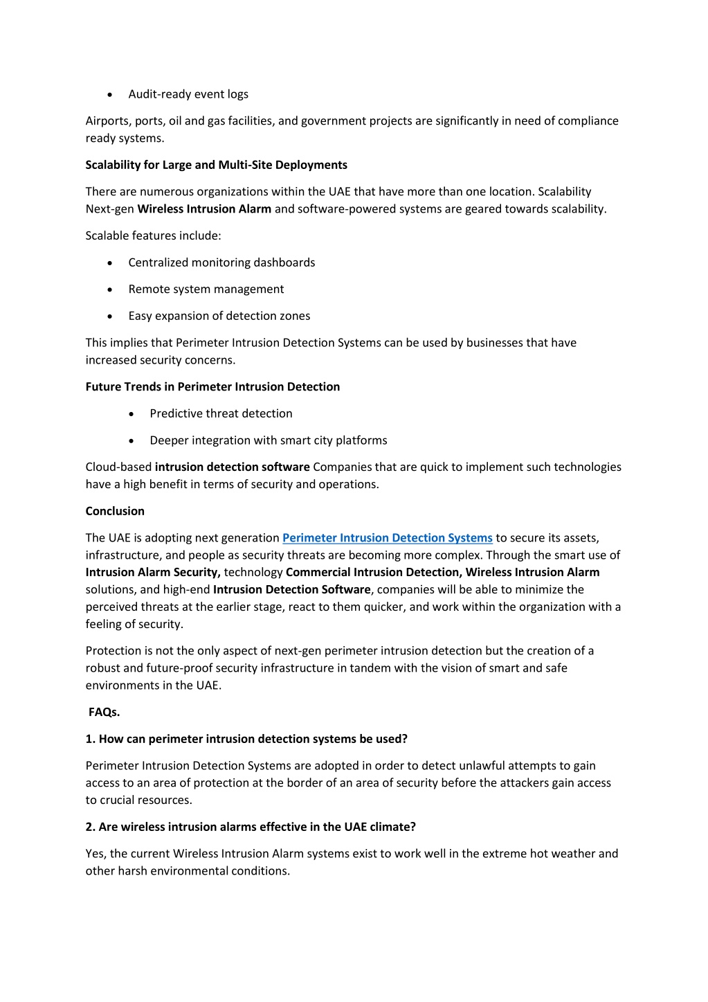 • Audit-ready event logs Airports, ports, oil and gas facilities, and government projects are significantly in need of compliance ready systems. Scalability for Large and Multi-Site Deployments There are numerous organizations within the UAE that have more than one location. Scalability Next-gen Wireless Intrusion Alarm and software-powered systems are geared towards scalability. Scalable features include: • Centralized monitoring dashboards • Remote system management • Easy expansion of detection zones This implies that Perimeter Intrusion Detection Systems can be used by businesses that have increased security concerns. Future Trends in Perimeter Intrusion Detection • Predictive threat detection • Deeper integration with smart city platforms Cloud-based intrusion detection software Companies that are quick to implement such technologies have a high benefit in terms of security and operations. Conclusion The UAE is adopting next generation Perimeter Intrusion Detection Systems to secure its assets, infrastructure, and people as security threats are becoming more complex. Through the smart use of Intrusion Alarm Security, technology Commercial Intrusion Detection, Wireless Intrusion Alarm solutions, and high-end Intrusion Detection Software, companies will be able to minimize the perceived threats at the earlier stage, react to them quicker, and work within the organization with a feeling of security. Protection is not the only aspect of next-gen perimeter intrusion detection but the creation of a robust and future-proof security infrastructure in tandem with the vision of smart and safe environments in the UAE. FAQs. 1. How can perimeter intrusion detection systems be used? Perimeter Intrusion Detection Systems are adopted in order to detect unlawful attempts to gain access to an area of protection at the border of an area of security before the attackers gain access to crucial resources. 2. Are wireless intrusion alarms effective in the UAE climate? Yes, the current Wireless Intrusion Alarm systems exist to work well in the extreme hot weather and other harsh environmental conditions.