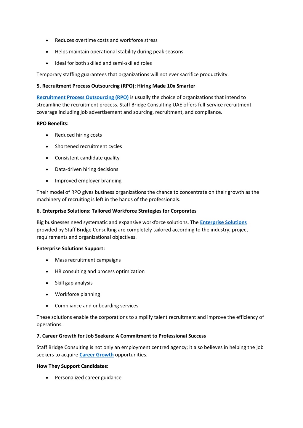 • Reduces overtime costs and workforce stress • Helps maintain operational stability during peak seasons • Ideal for both skilled and semi-skilled roles Temporary staffing guarantees that organizations will not ever sacrifice productivity. 5. Recruitment Process Outsourcing (RPO): Hiring Made 10x Smarter Recruitment Process Outsourcing (RPO) is usually the choice of organizations that intend to streamline the recruitment process. Staff Bridge Consulting UAE offers full-service recruitment coverage including job advertisement and sourcing, recruitment, and compliance. RPO Benefits: • Reduced hiring costs • Shortened recruitment cycles • Consistent candidate quality • Data-driven hiring decisions • Improved employer branding Their model of RPO gives business organizations the chance to concentrate on their growth as the machinery of recruiting is left in the hands of the professionals. 6. Enterprise Solutions: Tailored Workforce Strategies for Corporates Big businesses need systematic and expansive workforce solutions. The Enterprise Solutions provided by Staff Bridge Consulting are completely tailored according to the industry, project requirements and organizational objectives. Enterprise Solutions Support: • Mass recruitment campaigns • HR consulting and process optimization • Skill gap analysis • Workforce planning • Compliance and onboarding services These solutions enable the corporations to simplify talent recruitment and improve the efficiency of operations. 7. Career Growth for Job Seekers: A Commitment to Professional Success Staff Bridge Consulting is not only an employment centred agency; it also believes in helping the job seekers to acquire Career Growth opportunities. How They Support Candidates: • Personalized career guidance