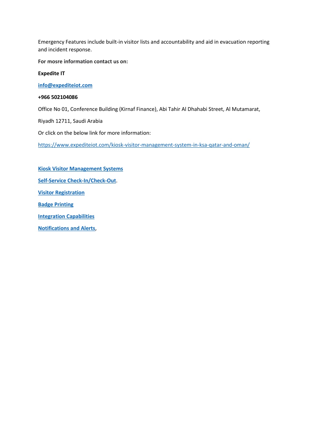 6. Emergency Features include built-in visitor lists and accountability and aid in evacuation reporting and incident response. For mosre information contact us on: Expedite IT info@expediteiot.com +966 502104086 Office No 01, Conference Building (Kirnaf Finance), Abi Tahir Al Dhahabi Street, Al Mutamarat, Riyadh 12711, Saudi Arabia Or click on the below link for more information: https://www.expediteiot.com/kiosk-visitor-management-system-in-ksa-qatar-and-oman/ Kiosk Visitor Management Systems Self-Service Check-In/Check-Out. Visitor Registration Badge Printing Integration Capabilities Notifications and Alerts,