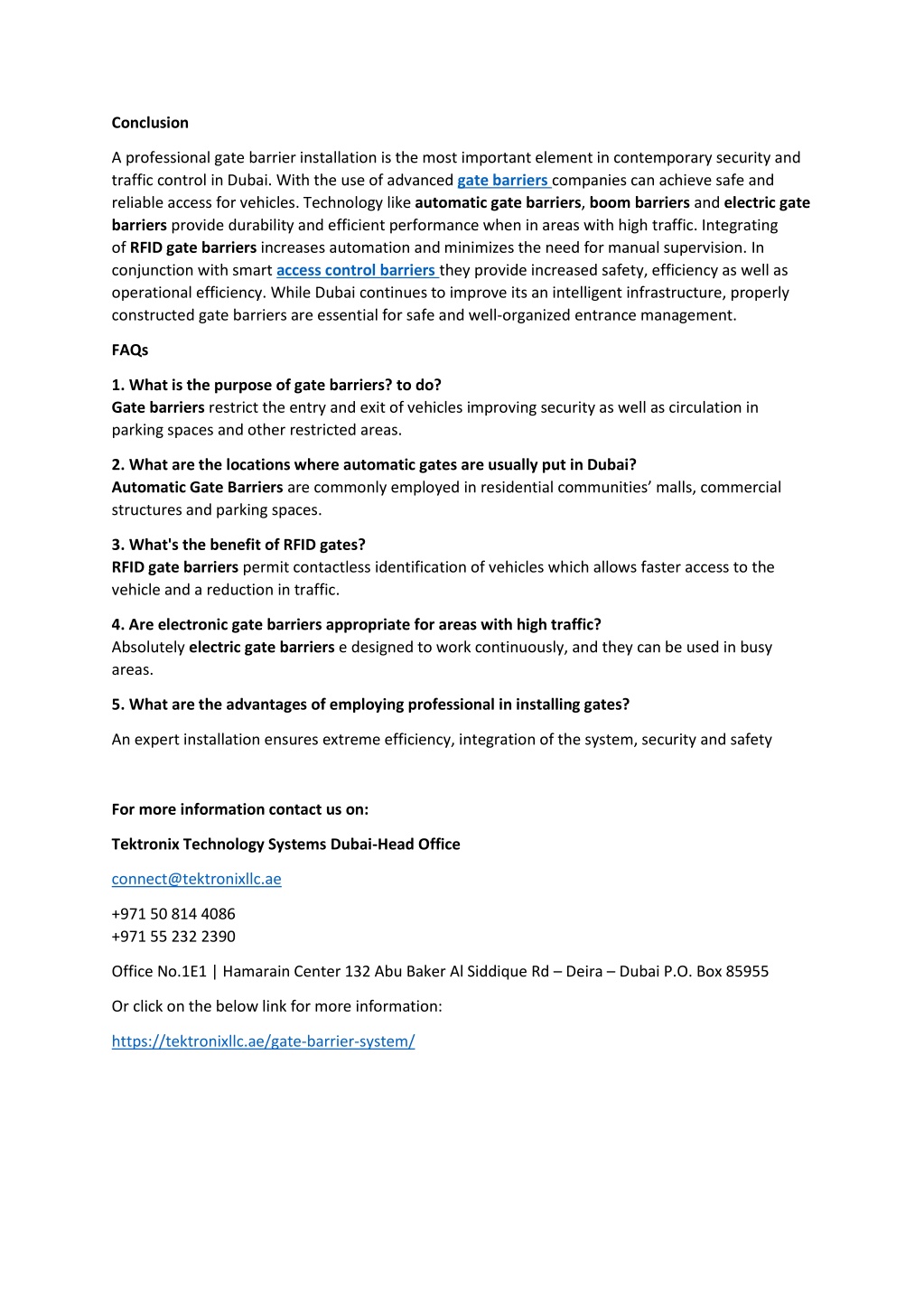 Conclusion A professional gate barrier installation is the most important element in contemporary security and traffic control in Dubai. With the use of advanced gate barriers companies can achieve safe and reliable access for vehicles. Technology like automatic gate barriers, boom barriers and electric gate barriers provide durability and efficient performance when in areas with high traffic. Integrating of RFID gate barriers increases automation and minimizes the need for manual supervision. In conjunction with smart access control barriers they provide increased safety, efficiency as well as operational efficiency. While Dubai continues to improve its an intelligent infrastructure, properly constructed gate barriers are essential for safe and well-organized entrance management. FAQs 1. What is the purpose of gate barriers? to do? Gate barriers restrict the entry and exit of vehicles improving security as well as circulation in parking spaces and other restricted areas. 2. What are the locations where automatic gates are usually put in Dubai? Automatic Gate Barriersare commonly employed in residential communities’ malls, commercial structures and parking spaces. 3. What's the benefit of RFID gates? RFID gate barriers permit contactless identification of vehicles which allows faster access to the vehicle and a reduction in traffic. 4. Are electronic gate barriers appropriate for areas with high traffic? Absolutely electric gate barriers e designed to work continuously, and they can be used in busy areas. 5. What are the advantages of employing professional in installing gates? An expert installation ensures extreme efficiency, integration of the system, security and safety For more information contact us on: Tektronix Technology Systems Dubai-Head Office connect@tektronixllc.ae +971 50 814 4086 +971 55 232 2390 Office No.1E1 | Hamarain Center 132 Abu Baker Al Siddique Rd – Deira – Dubai P.O. Box 85955 Or click on the below link for more information: https://tektronixllc.ae/gate-barrier-system/