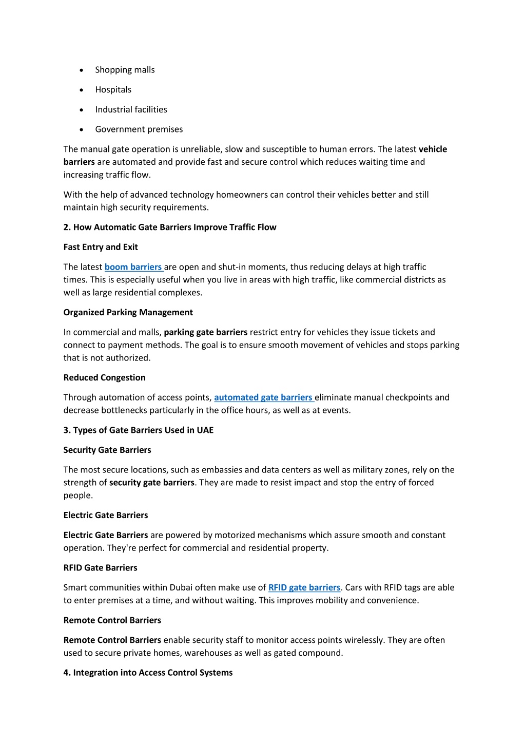 • Shopping malls • Hospitals • Industrial facilities • Government premises The manual gate operation is unreliable, slow and susceptible to human errors. The latest vehicle barriers are automated and provide fast and secure control which reduces waiting time and increasing traffic flow. With the help of advanced technology homeowners can control their vehicles better and still maintain high security requirements. 2. How Automatic Gate Barriers Improve Traffic Flow Fast Entry and Exit The latest boom barriers are open and shut-in moments, thus reducing delays at high traffic times. This is especially useful when you live in areas with high traffic, like commercial districts as well as large residential complexes. Organized Parking Management In commercial and malls, parking gate barriers restrict entry for vehicles they issue tickets and connect to payment methods. The goal is to ensure smooth movement of vehicles and stops parking that is not authorized. Reduced Congestion Through automation of access points, automated gate barriers eliminate manual checkpoints and decrease bottlenecks particularly in the office hours, as well as at events. 3. Types of Gate Barriers Used in UAE Security Gate Barriers The most secure locations, such as embassies and data centers as well as military zones, rely on the strength of security gate barriers. They are made to resist impact and stop the entry of forced people. Electric Gate Barriers Electric Gate Barriers are powered by motorized mechanisms which assure smooth and constant operation. They're perfect for commercial and residential property. RFID Gate Barriers Smart communities within Dubai often make use of RFID gate barriers. Cars with RFID tags are able to enter premises at a time, and without waiting. This improves mobility and convenience. Remote Control Barriers Remote Control Barriers enable security staff to monitor access points wirelessly. They are often used to secure private homes, warehouses as well as gated compound. 4. Integration into Access Control Systems