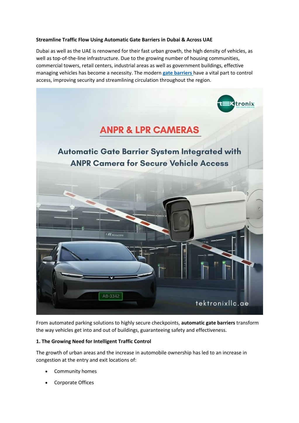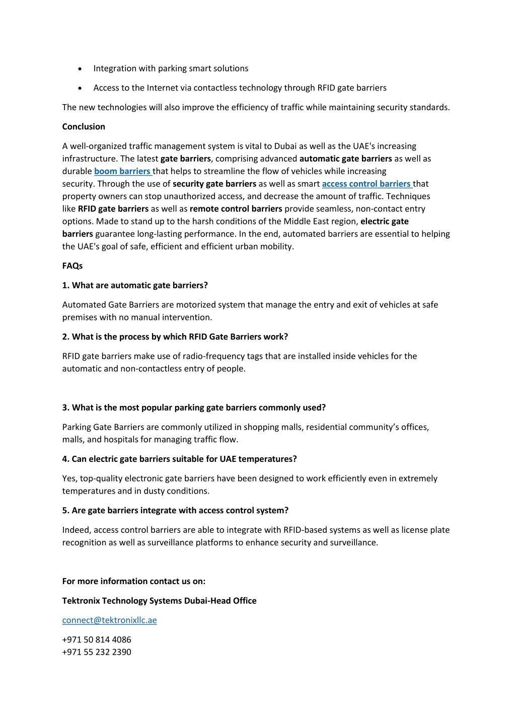 • Integration with parking smart solutions • Access to the Internet via contactless technology through RFID gate barriers The new technologies will also improve the efficiency of traffic while maintaining security standards. Conclusion A well-organized traffic management system is vital to Dubai as well as the UAE's increasing infrastructure. The latest gate barriers, comprising advanced automatic gate barriers as well as durable boom barriers that helps to streamline the flow of vehicles while increasing security. Through the use of security gate barriers as well as smart access control barriers that property owners can stop unauthorized access, and decrease the amount of traffic. Techniques like RFID gate barriers as well as remote control barriers provide seamless, non-contact entry options. Made to stand up to the harsh conditions of the Middle East region, electric gate barriers guarantee long-lasting performance. In the end, automated barriers are essential to helping the UAE's goal of safe, efficient and efficient urban mobility. FAQs 1. What are automatic gate barriers? Automated Gate Barriers are motorized system that manage the entry and exit of vehicles at safe premises with no manual intervention. 2. What is the process by which RFID Gate Barriers work? RFID gate barriers make use of radio-frequency tags that are installed inside vehicles for the automatic and non-contactless entry of people. 3. What is the most popular parking gate barriers commonly used? Parking Gate Barriers are commonly utilized in shopping malls, residential community’s offices, malls, and hospitals for managing traffic flow. 4. Can electric gate barriers suitable for UAE temperatures? Yes, top-quality electronic gate barriers have been designed to work efficiently even in extremely temperatures and in dusty conditions. 5. Are gate barriers integrate with access control system? Indeed, access control barriers are able to integrate with RFID-based systems as well as license plate recognition as well as surveillance platforms to enhance security and surveillance. For more information contact us on: Tektronix Technology Systems Dubai-Head Office connect@tektronixllc.ae +971 50 814 4086 +971 55 232 2390