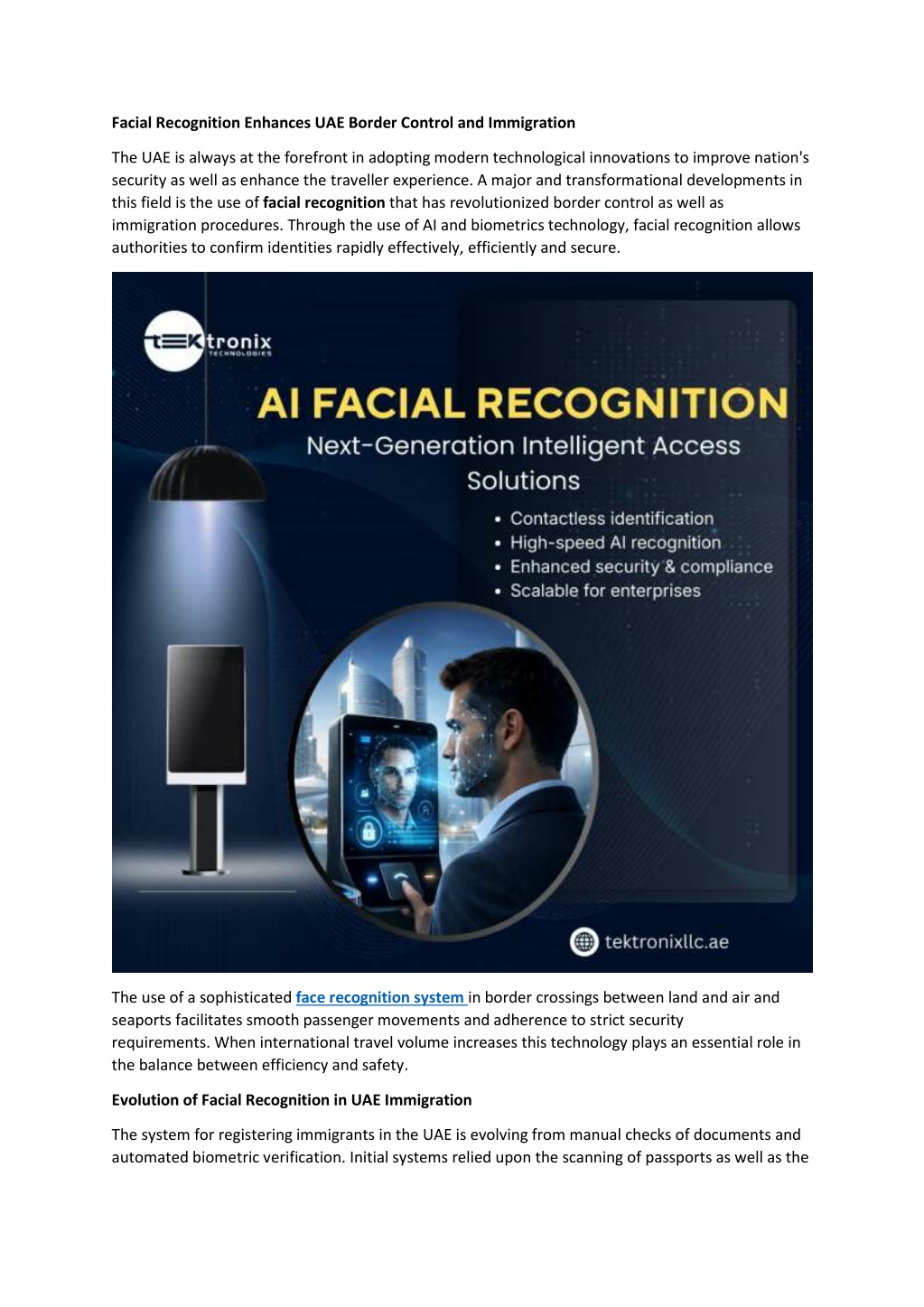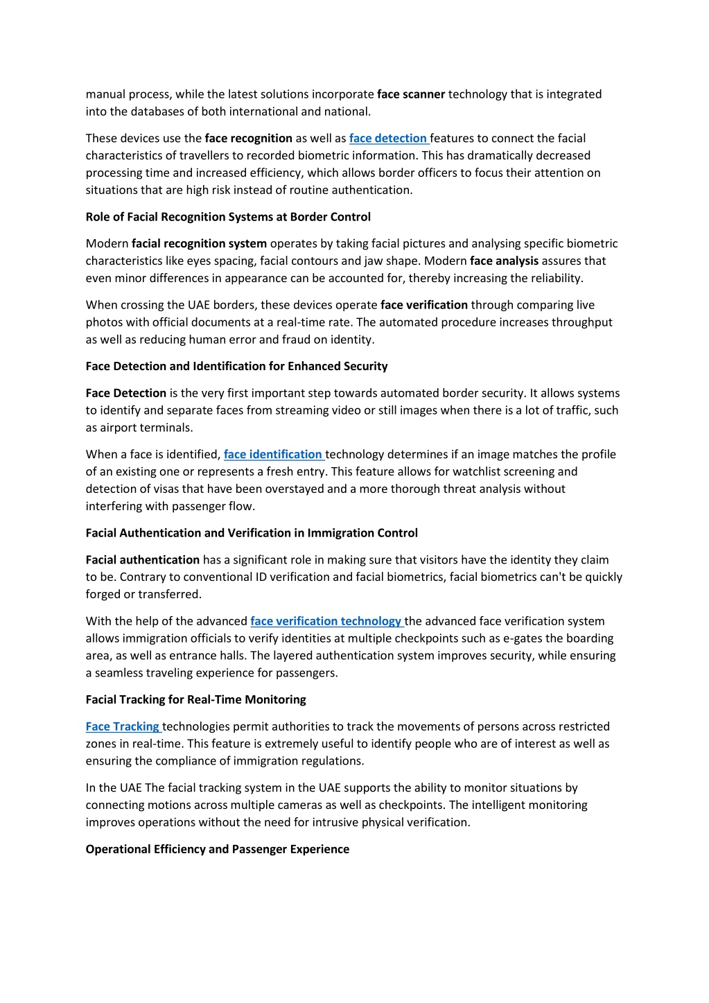 manual process, while the latest solutions incorporate face scanner technology that is integrated into the databases of both international and national. These devices use the face recognition as well as face detection features to connect the facial characteristics of travellers to recorded biometric information. This has dramatically decreased processing time and increased efficiency, which allows border officers to focus their attention on situations that are high risk instead of routine authentication. Role of Facial Recognition Systems at Border Control Modern facial recognition system operates by taking facial pictures and analysing specific biometric characteristics like eyes spacing, facial contours and jaw shape. Modern face analysis assures that even minor differences in appearance can be accounted for, thereby increasing the reliability. When crossing the UAE borders, these devices operate face verification through comparing live photos with official documents at a real-time rate. The automated procedure increases throughput as well as reducing human error and fraud on identity. Face Detection and Identification for Enhanced Security Face Detection is the very first important step towards automated border security. It allows systems to identify and separate faces from streaming video or still images when there is a lot of traffic, such as airport terminals. When a face is identified, face identification technology determines if an image matches the profile of an existing one or represents a fresh entry. This feature allows for watchlist screening and detection of visas that have been overstayed and a more thorough threat analysis without interfering with passenger flow. Facial Authentication and Verification in Immigration Control Facial authentication has a significant role in making sure that visitors have the identity they claim to be. Contrary to conventional ID verification and facial biometrics, facial biometrics can't be quickly forged or transferred. With the help of the advanced face verification technology the advanced face verification system allows immigration officials to verify identities at multiple checkpoints such as e-gates the boarding area, as well as entrance halls. The layered authentication system improves security, while ensuring a seamless traveling experience for passengers. Facial Tracking for Real-Time Monitoring Face Tracking technologies permit authorities to track the movements of persons across restricted zones in real-time. This feature is extremely useful to identify people who are of interest as well as ensuring the compliance of immigration regulations. In the UAE The facial tracking system in the UAE supports the ability to monitor situations by connecting motions across multiple cameras as well as checkpoints. The intelligent monitoring improves operations without the need for intrusive physical verification. Operational Efficiency and Passenger Experience