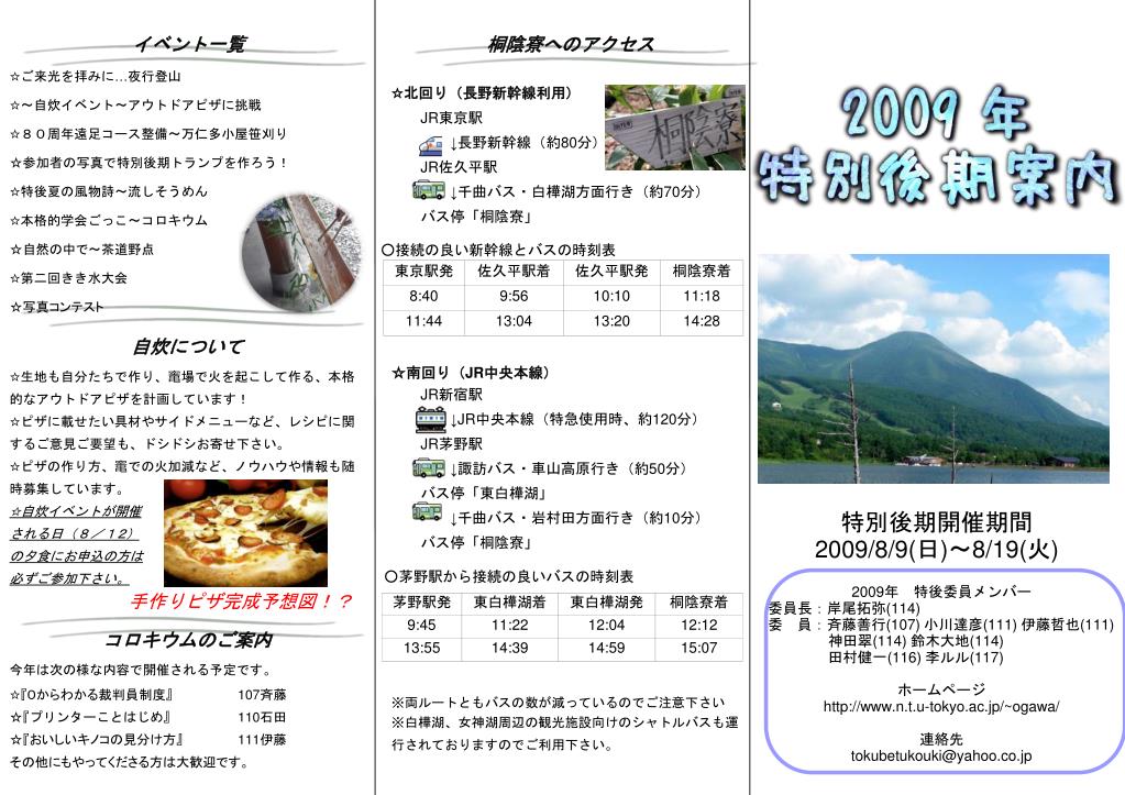 イベント一覧 ☆ご来光を拝みに…夜行登山 ☆〜自炊イベント〜アウトドアピザに挑戦 ☆80周年遠足コース整備〜万仁多小屋笹刈り ☆参加者の写真で特別後期トランプを作ろう! ☆特後夏の風物詩〜流しそうめん ☆本格的学会ごっこ〜コロキウム ☆自然の中で~茶道野点 ☆第二回きき水大会 ☆写真コンテスト 桐陰寮へのアクセス ☆北回り(長野新幹線利用) JR東京駅 ↓長野新幹線(約80分) JR佐久平駅 ↓千曲バス・白樺湖方面行き(約70分) バス停「桐陰寮」 ○接続の良い新幹線とバスの時刻表 自炊について ☆生地も自分たちで作り、竃場で火を起こして作る、本格的なアウトドアピザを計画しています! ☆ピザに載せたい具材やサイドメニューなど、レシピに関するご意見ご要望も、ドシドシお寄せ下さい。 ☆ピザの作り方、竃での火加減など、ノウハウや情報も随時募集しています。 ☆自炊イベントが開催 される日(8/12) の夕食にお申込の方は 必ずご参加下さい。 ☆南回り(JR中央本線) JR新宿駅 ↓JR中央本線(特急使用時、約120分) JR茅野駅 ↓諏訪バス・車山高原行き(約50分) バス停「東白樺湖」 ↓千曲バス・岩村田方面行き(約10分) バス停「桐陰寮」 特別後期開催期間 2009/8/9(日)〜8/19(火) ○茅野駅から接続の良いバスの時刻表 2009年 特後委員メンバー 委員長:岸尾拓弥(114) 委 員:斉藤善行(107) 小川達彦(111) 伊藤哲也(111) 神田翠(114) 鈴木大地(114)石田浩一(110) 田村健一(116) 李ルル(117) ホームページ http://www.n.t.u-tokyo.ac.jp/~ogawa/ 連絡先 tokubetukouki@yahoo.co.jp 手作りピザ完成予想図!? コロキウムのご案内 今年は次の様な内容で開催される予定です。 ☆『0からわかる裁判員制度』107斉藤 ☆『プリンターことはじめ』 110石田 ☆『おいしいキノコの見分け方』 111伊藤 その他にもやってくださる方は大歓迎です。 ※両ルートともバスの数が減っているのでご注意下さい ※白樺湖、女神湖周辺の観光施設向けのシャトルバスも運行されておりますのでご利用下さい。