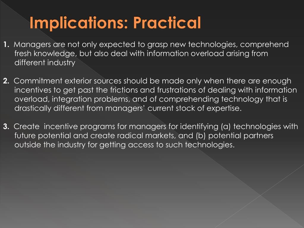 Implications: Practical 1. Managers are not only expected to grasp new technologies, comprehend fresh knowledge, but also deal with information overload arising from different industry 2. Commitment exterior sources should be made only when there are enough incentives to get past the frictions and frustrations of dealing with information overload, integration problems, and of comprehending technology that is drastically different from managers’ current stock of expertise. 3. Create incentive programs for managers for identifying (a) technologies with future potential and create radical markets, and (b) potential partners outside the industry for getting access to such technologies.