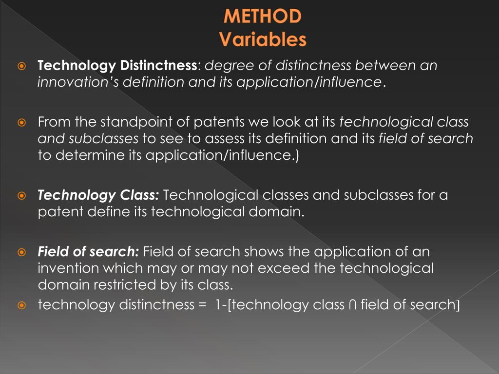 METHODVariables • Technology Distinctness: degree of distinctness between an innovation’s definition and its application/influence. • From the standpoint of patents we look at itstechnological class and subclasses to see to assess its definition and its field of search to determine its application/influence.) • Technology Class: Technological classes and subclasses for a patent define its technological domain. • Field of search: Field of search shows the application of an invention which may or may not exceed the technological domain restricted by its class. • technology distinctness = 1-[technology class ∩ field of search]