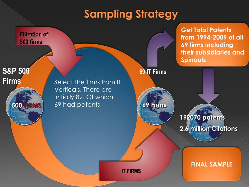 Sampling Strategy Get Total Patents from 1994-2009 of all 69 firms including their subsidiaries and Spinouts Filtration of 500 firms S&P 500 Firms 69 IT Firms • Select the firms from IT Verticals. There are initially 82. Of which 69 had patents 69 Firms 500 FIRMS 192070 patents 2.6 million Citations FINAL SAMPLE IT FIRMS