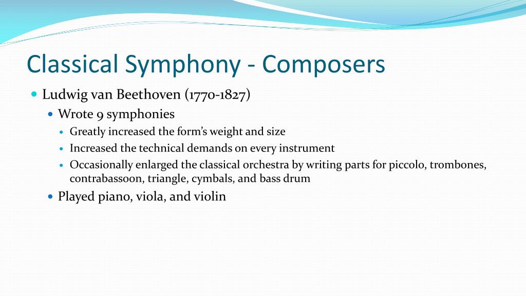 Classical Symphony - Composers • Ludwig van Beethoven (1770-1827) • Wrote 9 symphonies • Greatly increased the form’s weight and size • Increased the technical demands on every instrument • Occasionally enlarged the classical orchestra by writing parts for piccolo, trombones, contrabassoon, triangle, cymbals, and bass drum • Played piano, viola, and violin
