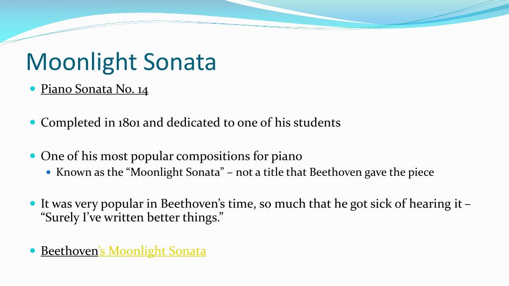 Moonlight Sonata • Piano Sonata No. 14 • Completed in 1801 and dedicated to one of his students • One of his most popular compositions for piano • Known as the “Moonlight Sonata” – not a title that Beethoven gave the piece • It was very popular in Beethoven’s time, so much that he got sick of hearing it – “Surely I’ve written better things.” • Beethoven’s Moonlight Sonata