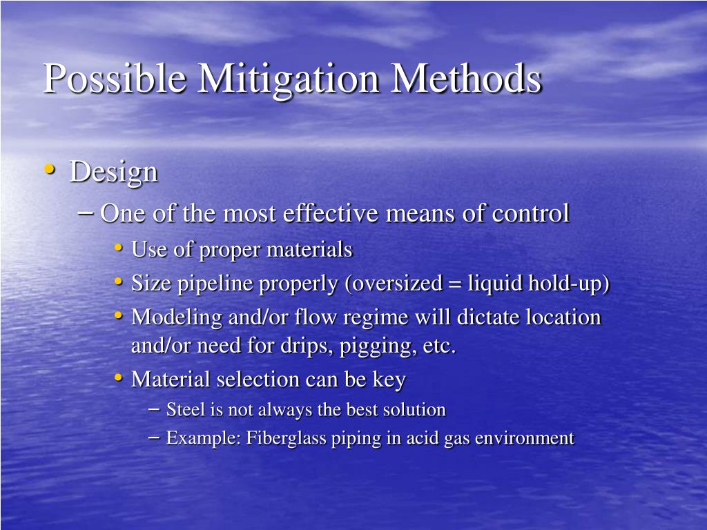 Possible Mitigation Methods • Design • One of the most effective means of control • Use of proper materials • Size pipeline properly (oversized = liquid hold-up) • Modeling and/or flow regime will dictate location and/or need for drips, pigging, etc. • Material selection can be key • Steel is not always the best solution • Example: Fiberglass piping in acid gas environment