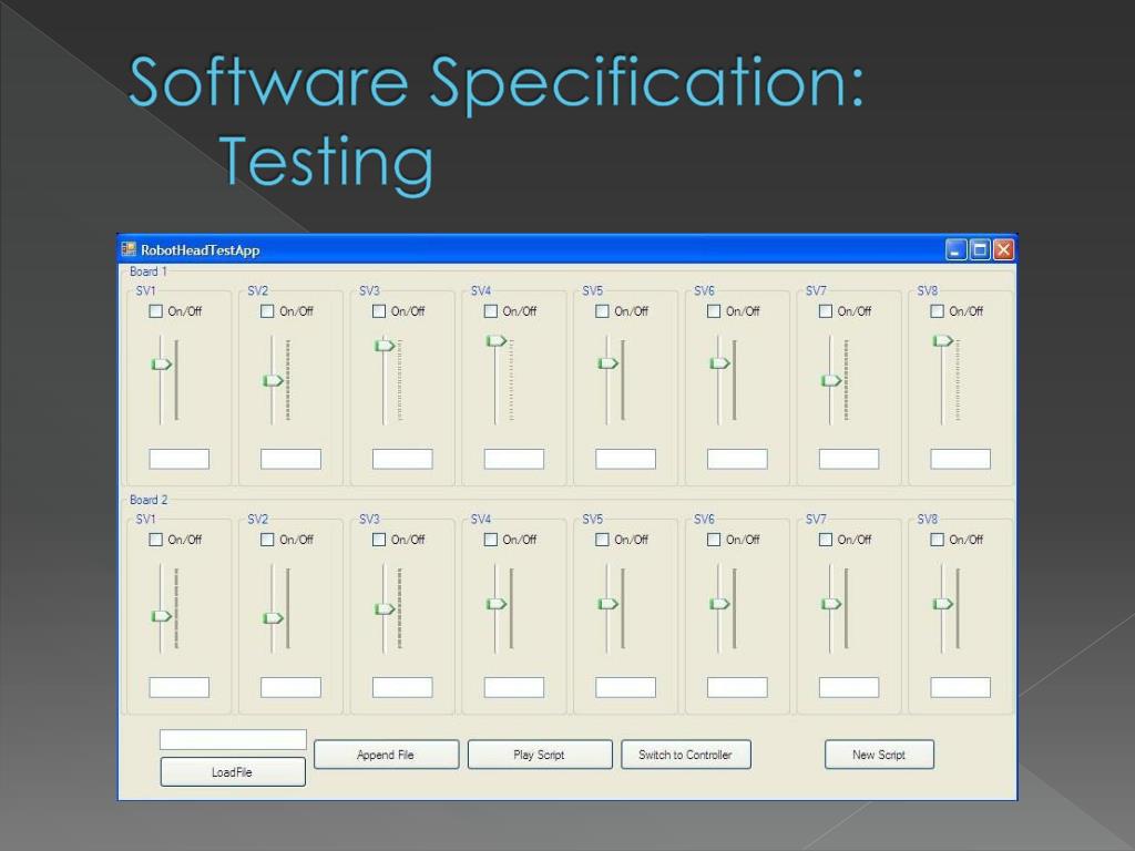 Software Specification: Library • Robot Head class • Provides functions for controlling each servo (face, eyes, neck) • Graphical User Interface • Allow script building • Listbox – easy to manage and build scripts • Building facial positions (eyebrows and mouth) • Interface with controller • Allow for direct control of head • Mapping buttons to face emotions