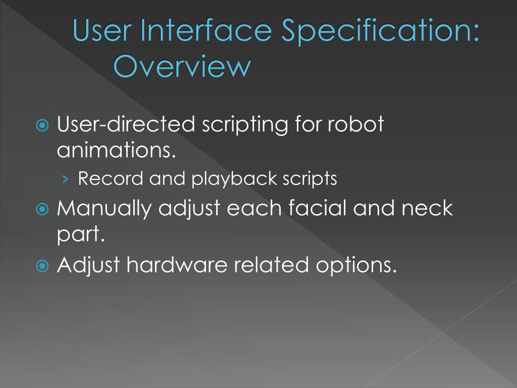User Interface Specification: Overview • User-directed scripting for robot animations. • Record and playback scripts • Manually adjust each facial and neck part. • Adjust hardware related options.
