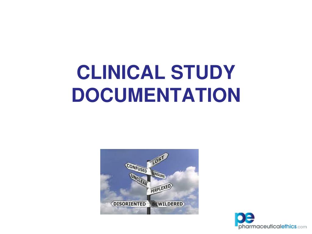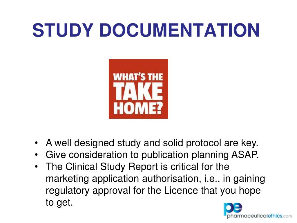 STUDY DOCUMENTATION • A well designed study and solid protocol are key. • Give consideration to publication planning ASAP. • The Clinical Study Report is critical for the marketing application authorisation, i.e., in gaining regulatory approval for the Licence that you hope to get.