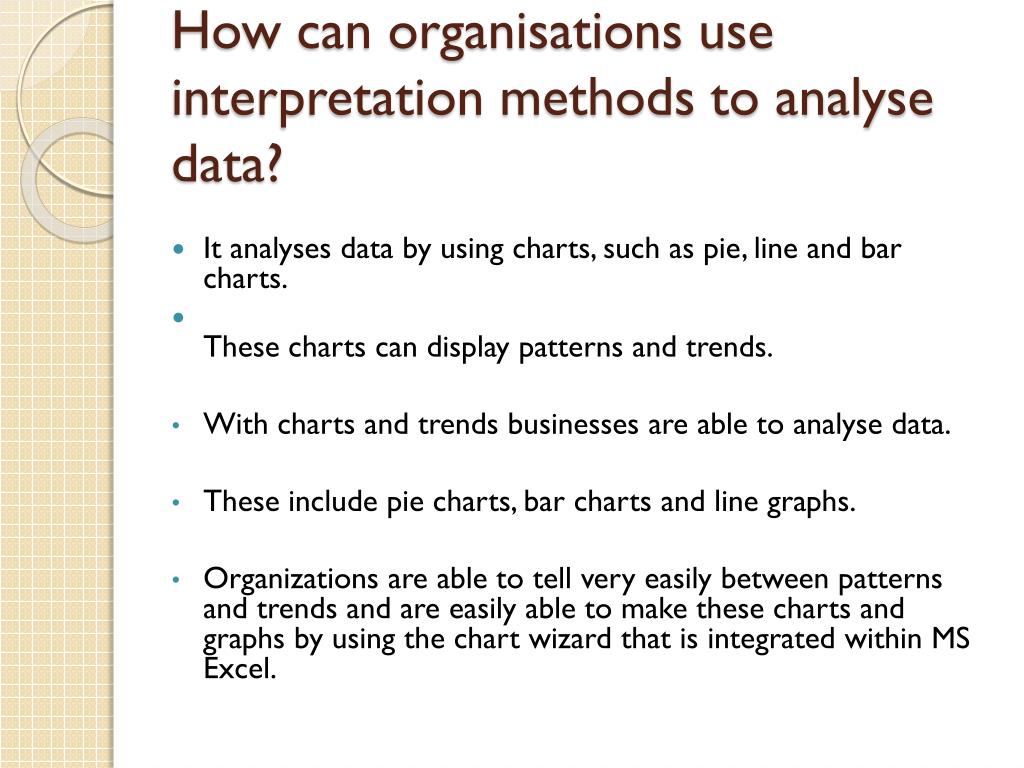 How can organisations use interpretation methods to analyse data? • It analyses data by using charts, such as pie, line and bar charts. • These charts can display patterns and trends. • With charts and trends businesses are able to analyse data. • These include pie charts, bar charts and line graphs. • Organizations are able to tell very easily between patterns and trends and are easily able to make these charts and graphs by using the chart wizard that is integrated within MS Excel.