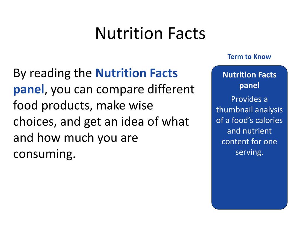 Term to Know Nutrition Facts panel Provides a thumbnail analysis of a food’s calories and nutrient content for one serving. Nutrition Facts By reading the Nutrition Facts panel, you can compare different food products, make wise choices, and get an idea of what and how much you are consuming.