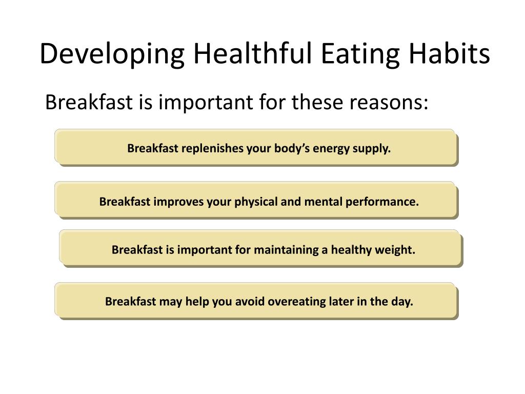 Developing Healthful Eating Habits Breakfast is important for these reasons: Breakfast replenishes your body’s energy supply. Breakfast improves your physical and mental performance. Breakfast is important for maintaining a healthy weight. Breakfast may help you avoid overeating later in the day.