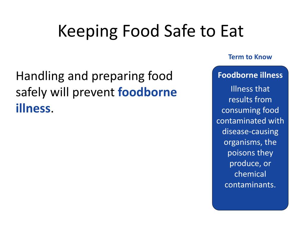 Term to Know Foodborne illness Illness that results from consuming food contaminated with disease-causing organisms, the poisons they produce, or chemical contaminants. Keeping Food Safe to Eat Handling and preparing food safely will prevent foodborne illness.