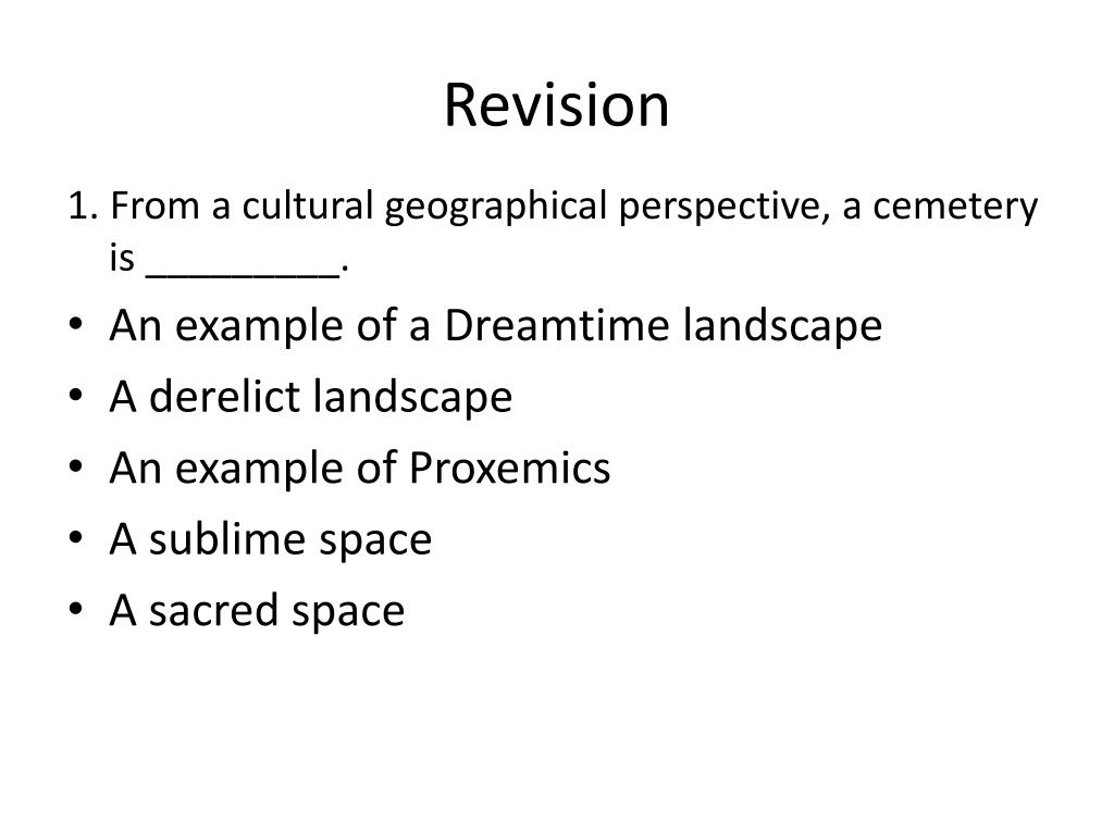 Revision 1. From a cultural geographical perspective, a cemetery is _________. • An example of a Dreamtime landscape • A derelict landscape • An example of Proxemics • A sublime space • A sacred space