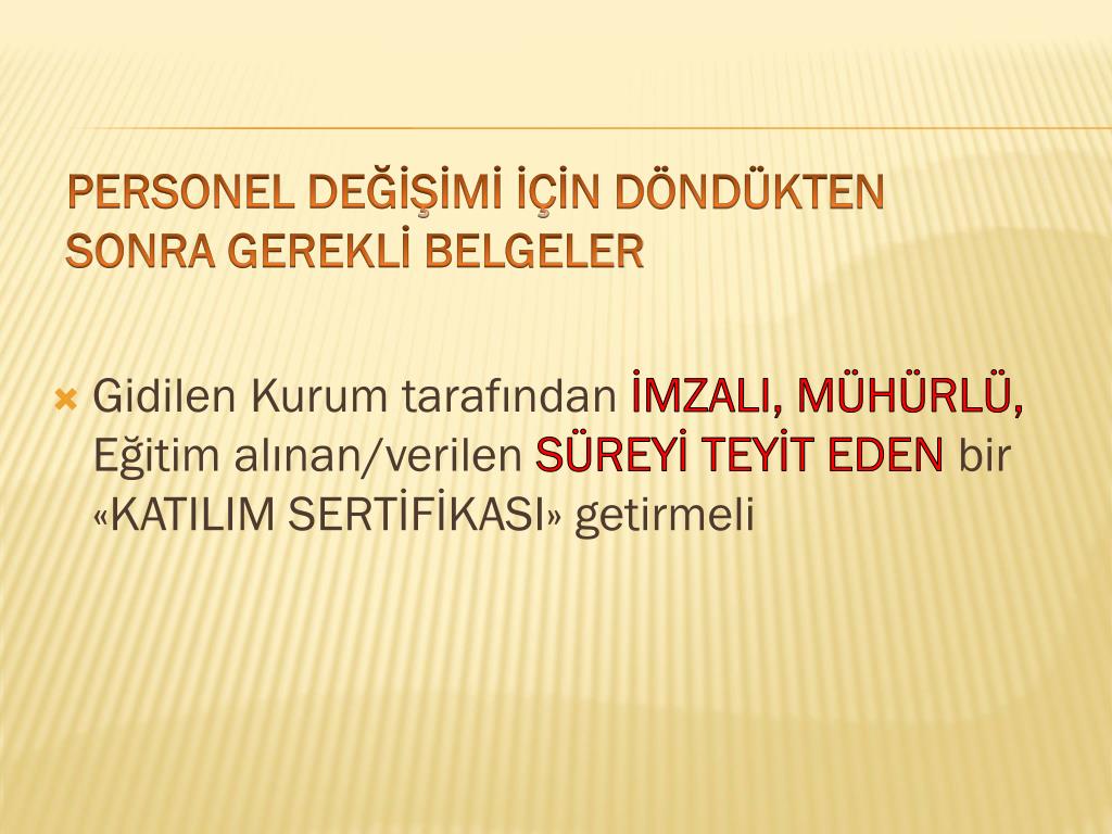 Gidilen Kurum tarafından İMZALI, MÜHÜRLÜ, Eğitim alınan/verilen SÜREYİ TEYİT EDEN bir «KATILIM SERTİFİKASI» getirmeli PERSONEL DEĞİŞİMİ İÇİN DÖNDÜKTEN SONRA GEREKLİ BELGELER