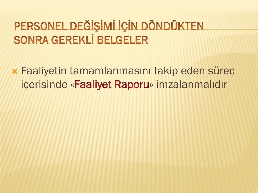 Faaliyetin tamamlanmasını takip eden süreç içerisinde «Faaliyet Raporu» imzalanmalıdır PERSONEL DEĞİŞİMİ İÇİN DÖNDÜKTEN SONRA GEREKLİ BELGELER
