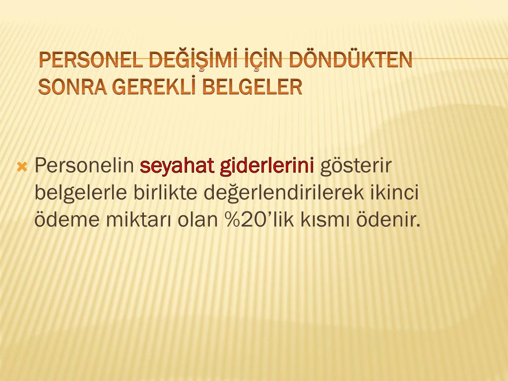 Personelin seyahat giderlerini gösterir belgelerle birlikte değerlendirilerek ikinci ödeme miktarı olan %20’lik kısmı ödenir. PERSONEL DEĞİŞİMİ İÇİN DÖNDÜKTEN SONRA GEREKLİ BELGELER