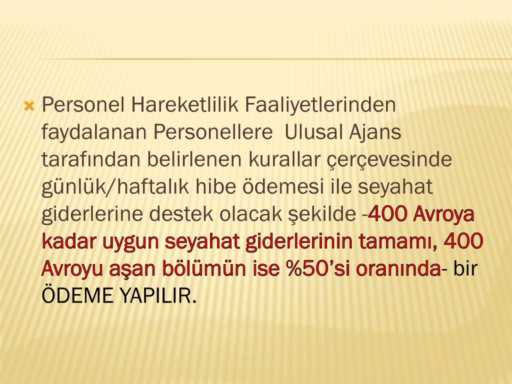 Personel Hareketlilik Faaliyetlerinden faydalanan Personellere Ulusal Ajans tarafından belirlenen kurallar çerçevesinde günlük/haftalık hibe ödemesi ile seyahat giderlerine destek olacak şekilde -400 Avroya kadar uygun seyahat giderlerinin tamamı, 400 Avroyu aşan bölümün ise %50’si oranında- bir ÖDEME YAPILIR.