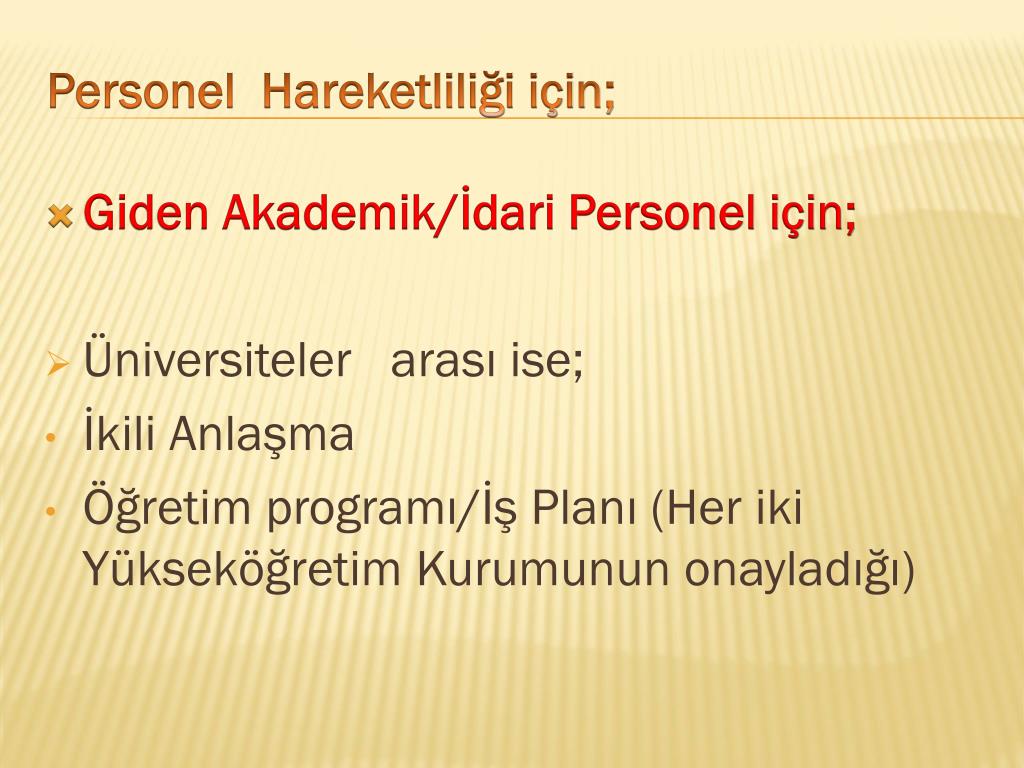 Giden Akademik/İdari Personel için; • Üniversiteler arası ise; • İkili Anlaşma • Öğretim programı/İş Planı (Her iki Yükseköğretim Kurumunun onayladığı) Personel Hareketliliği için;