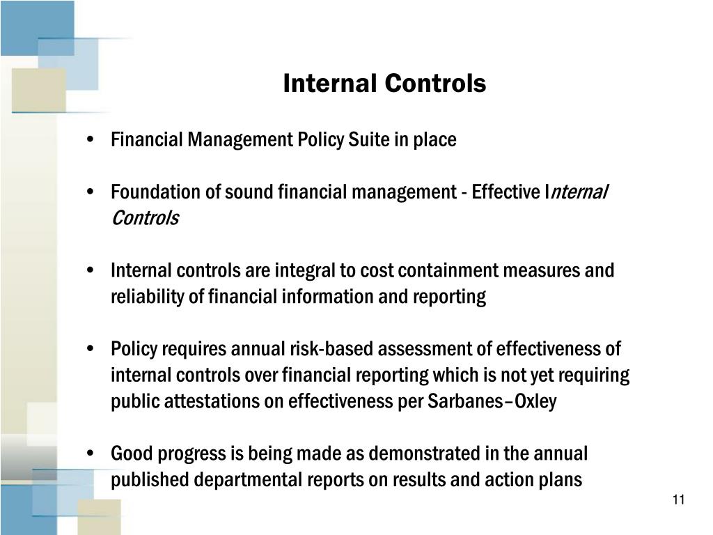 Internal Controls • Financial Management Policy Suite in place • Foundation of sound financial management - Effective Internal Controls • Internal controls are integral to cost containment measures and reliability of financial information and reporting • Policy requires annual risk-based assessment of effectiveness of internal controls over financial reporting which is not yet requiring public attestations on effectiveness per Sarbanes–Oxley • Good progress is being made as demonstrated in the annual published departmental reports on results and action plans
