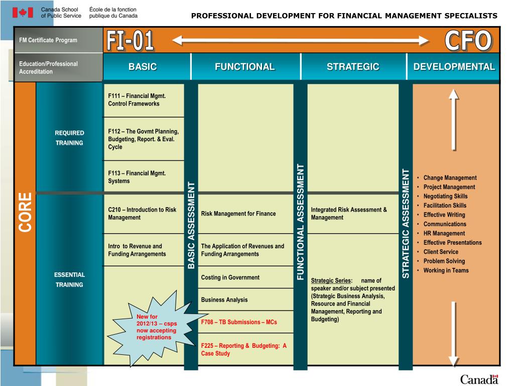STRATEGIC ASSESSMENT FUNCTIONAL ASSESSMENT BASIC ASSESSMENT PROFESSIONAL DEVELOPMENT FOR FINANCIAL MANAGEMENT SPECIALISTS FI-01 CFO BASIC FUNCTIONAL STRATEGIC DEVELOPMENTAL CORE New for 2012/13 – csps now accepting registrations