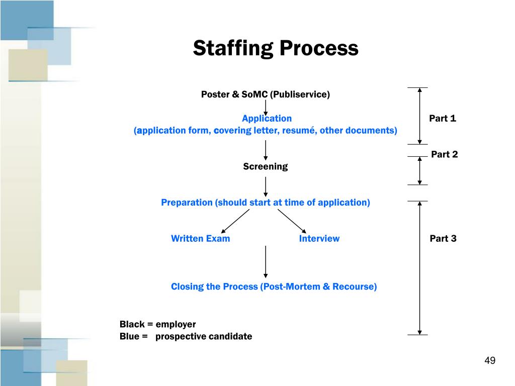 Staffing Process Poster & SoMC (Publiservice) Application Part 1 (application form, covering letter, resumé, other documents) Part 2 Screening Preparation (should start at time of application) Written ExamInterview Part 3 Closing the Process (Post-Mortem & Recourse) Black = employer Blue = prospective candidate