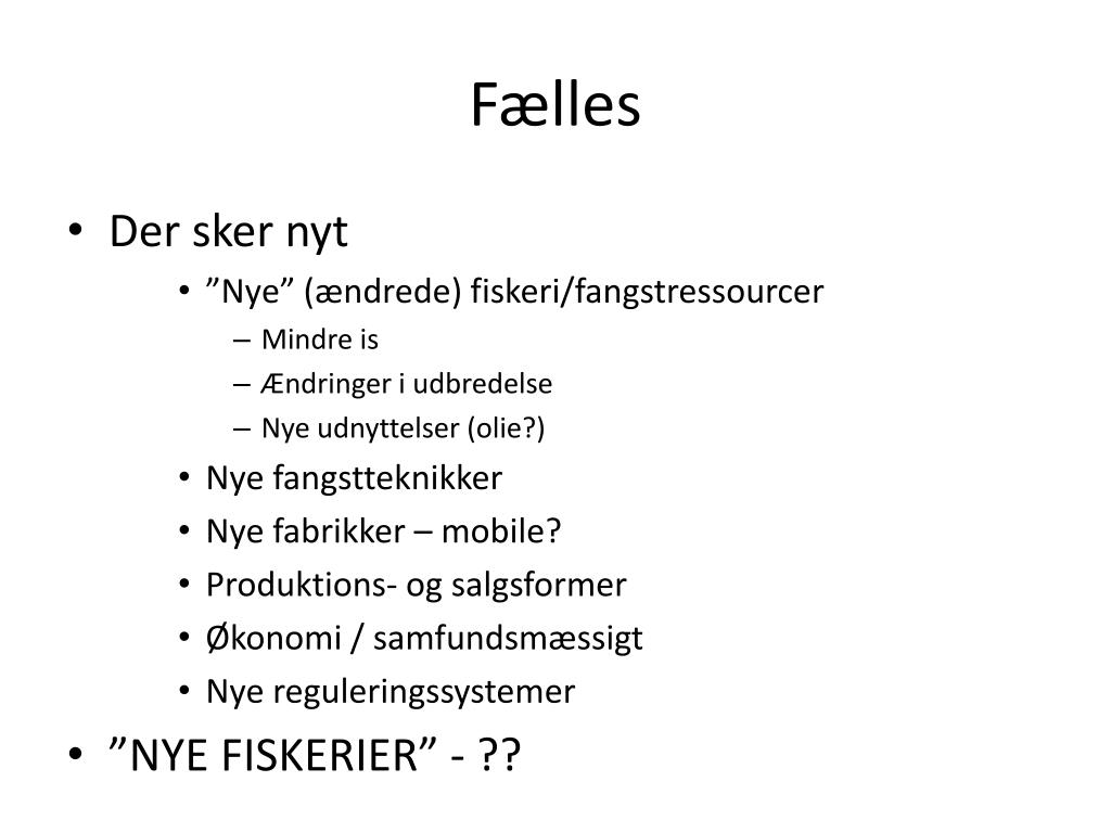 Fælles • Der sker nyt • ”Nye” (ændrede) fiskeri/fangstressourcer • Mindre is • Ændringer i udbredelse • Nye udnyttelser (olie?) • Nye fangstteknikker • Nye fabrikker – mobile? • Produktions- og salgsformer • Økonomi / samfundsmæssigt • Nye reguleringssystemer • ”NYE FISKERIER” - ??