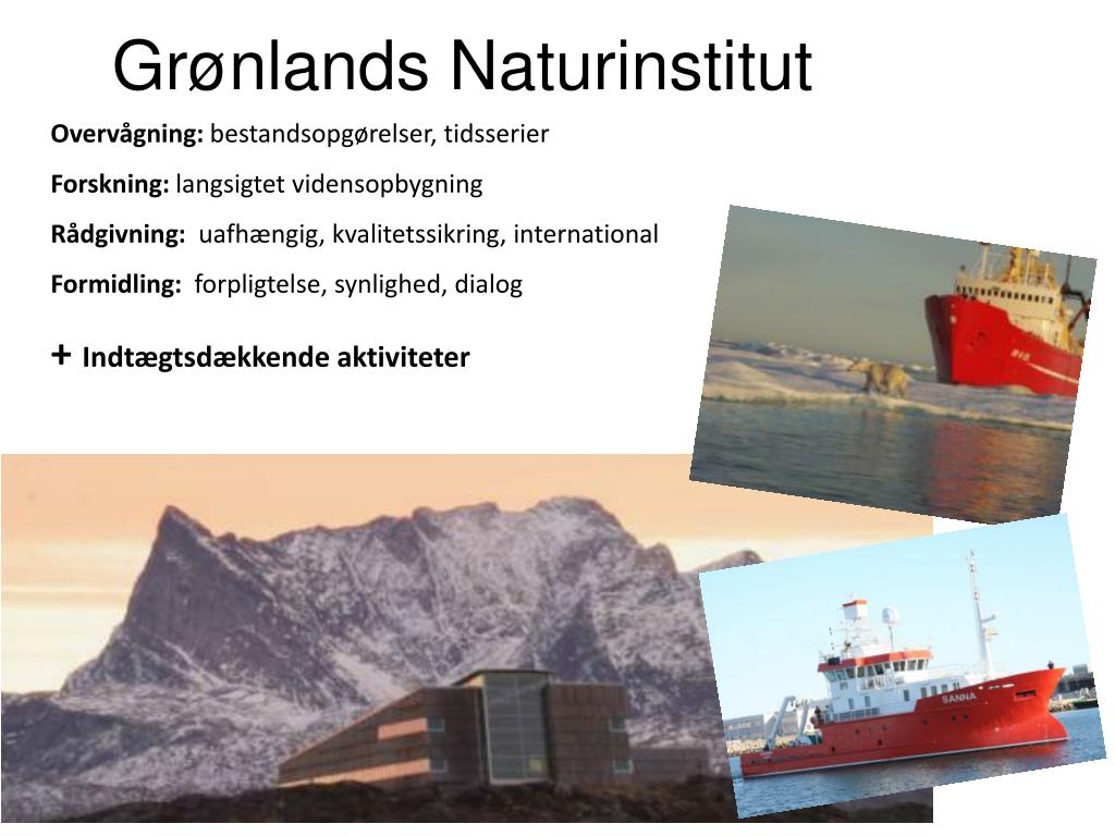 Grønlands Naturinstitut Overvågning: bestandsopgørelser, tidsserier Forskning: langsigtet vidensopbygning Rådgivning: uafhængig, kvalitetssikring, international Formidling: forpligtelse, synlighed, dialog + Indtægtsdækkende aktiviteter