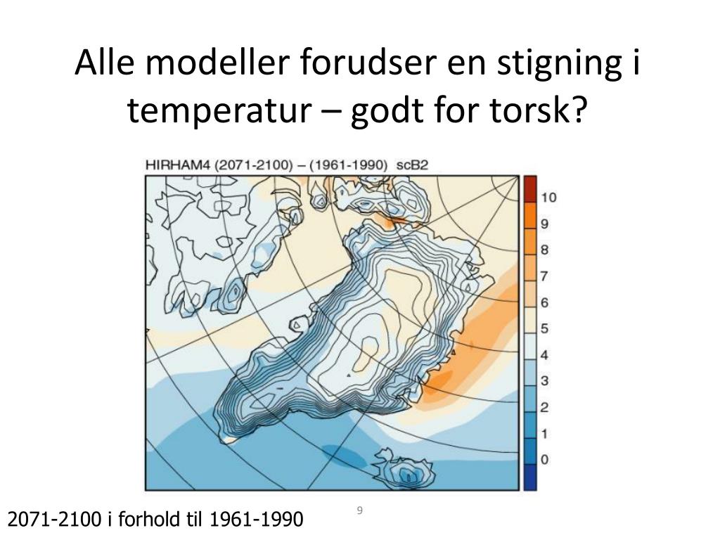 Alle modeller forudser en stigning i temperatur – godt for torsk? 2071-2100 i forhold til 1961-1990 Kiilsholm et al. (2003) Geophys Res Lett 30(9), 1485 Rysgaard et al. (2003) Arctic, Antarctic and Alpine Research 35:301-312