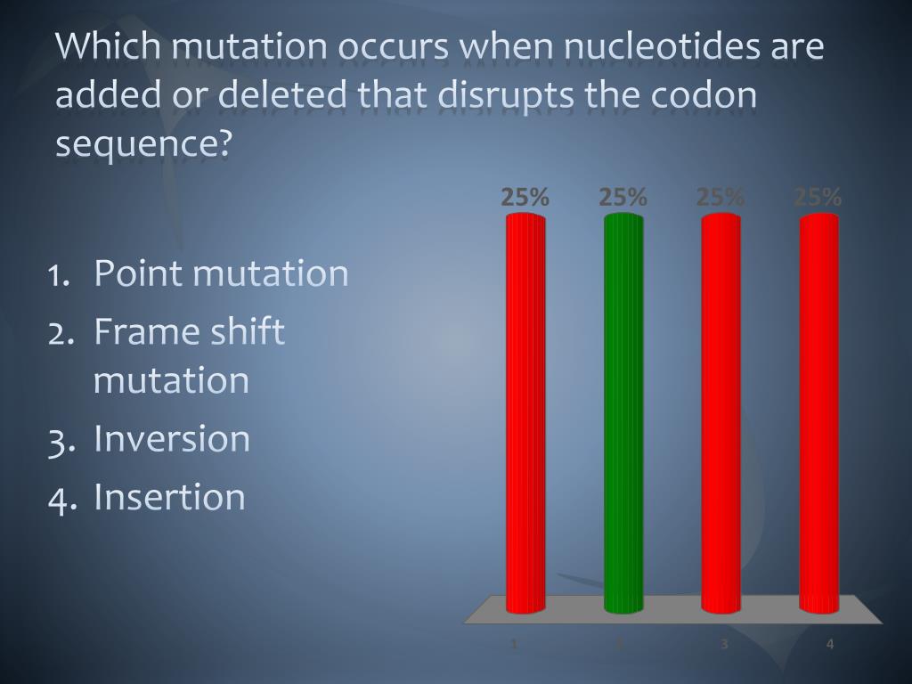 Which mutation occurs when nucleotides are added or deleted that disrupts the codon sequence? • Point mutation • Frame shift mutation • Inversion • Insertion