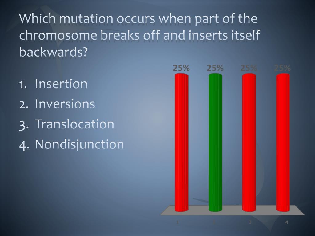 Which mutation occurs when part of the chromosome breaks off and inserts itself backwards? • Insertion • Inversions • Translocation • Nondisjunction