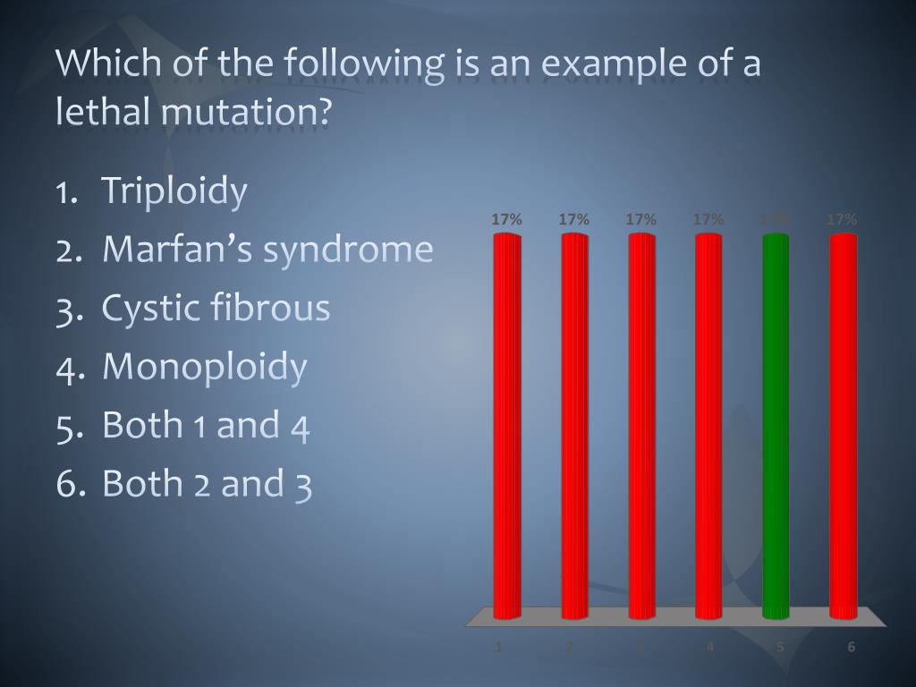 Which of the following is an example of a lethal mutation? • Triploidy • Marfan’s syndrome • Cystic fibrous • Monoploidy • Both 1 and 4 • Both 2 and 3