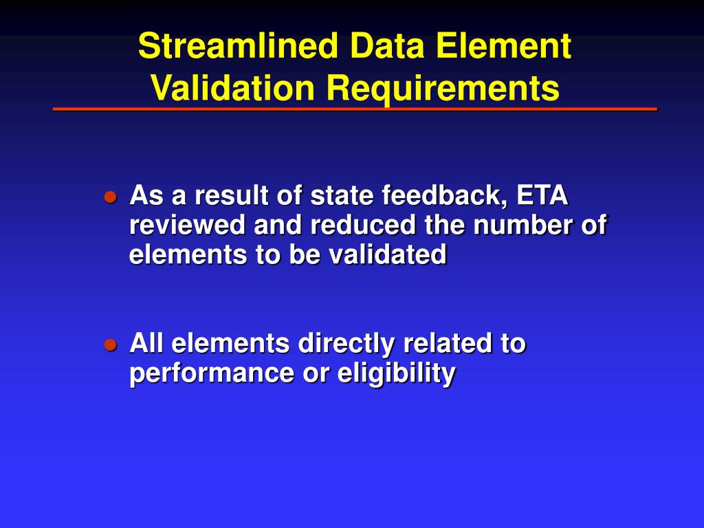 Streamlined Data Element Validation Requirements • As a result of state feedback, ETA reviewed and reduced the number of elements to be validated • All elements directly related to performance or eligibility