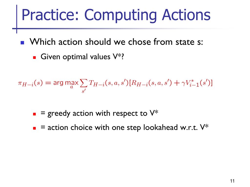 Practice: Computing Actions • Which action should we chose from state s: • Given optimal values V*? • = greedy action with respect to V* • = action choice with one step lookaheadw.r.t. V*