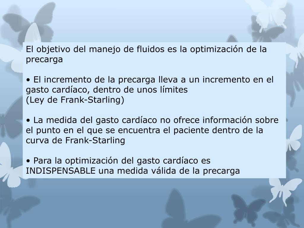 LEY FRANK STARLING NO RTA • HABILIDAD INTRINSECA DEL CORAZON DE ADAPTARSE A VOLUMENES CRECIENTES • MAS SE ESTIRA MUSC EN EL LLENADO MAS FUERTE CONTRACCION Y MAYOR BOMBEO SANGRE • BOLO VE EF LEV PERO HAY TANTOS FACTORES QUE INTERVIENEN QUE SOLO MEDIR PRECARGA NO DICE QUIEN RESPONDE AL FLUIDO