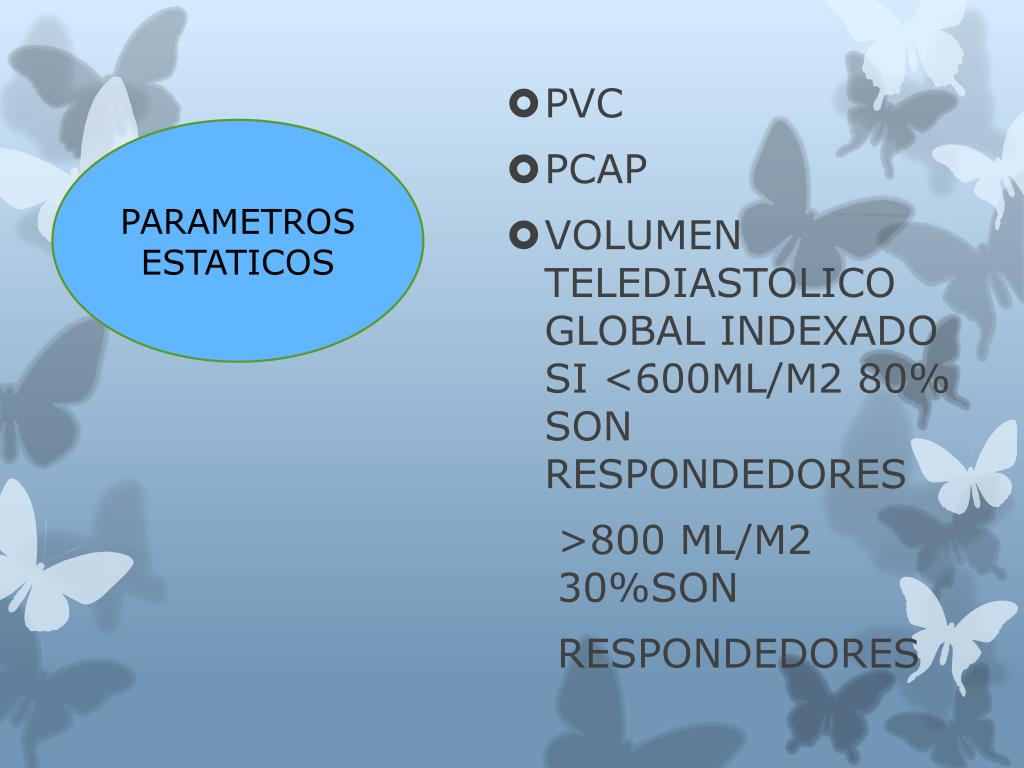 PARAMETROS ESTATICOS • PVC • PCAP • VOLUMEN TELEDIASTOLICO GLOBAL INDEXADO SI <600ML/M2 80% SON RESPONDEDORES >800 ML/M2 30%SON RESPONDEDORES