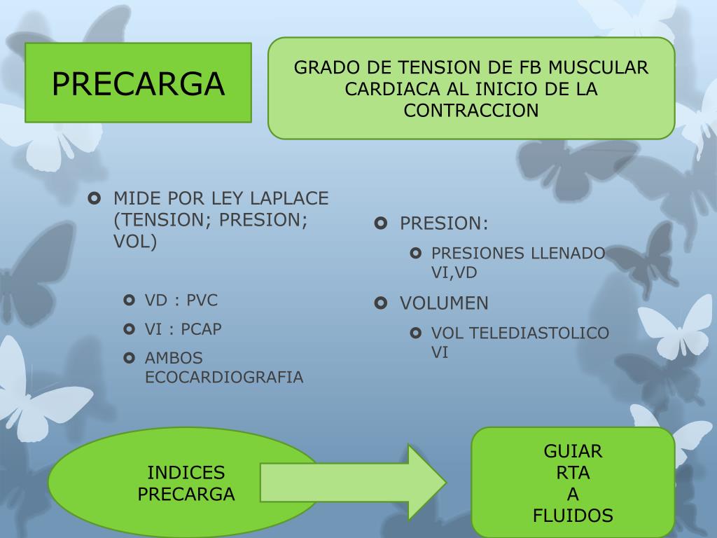 GRADO DE TENSION DE FB MUSCULAR CARDIACA AL INICIO DE LA CONTRACCION PRECARGA • MIDE POR LEY LAPLACE (TENSION; PRESION; VOL) • VD : PVC • VI : PCAP • AMBOS ECOCARDIOGRAFIA • PRESION: • PRESIONES LLENADO VI,VD • VOLUMEN • VOL TELEDIASTOLICO VI INDICES PRECARGA GUIAR RTA A FLUIDOS