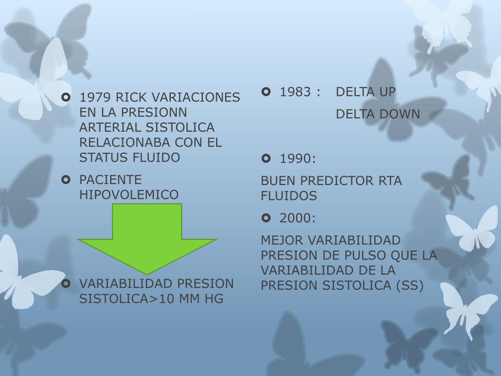 1979 RICK VARIACIONES EN LA PRESIONN ARTERIAL SISTOLICA RELACIONABA CON EL STATUS FLUIDO • PACIENTE HIPOVOLEMICO • VARIABILIDAD PRESION SISTOLICA>10 MM HG • 1983 : DELTA UP DELTA DOWN • 1990: BUEN PREDICTOR RTA FLUIDOS • 2000: MEJOR VARIABILIDAD PRESION DE PULSO QUE LA VARIABILIDAD DE LA PRESION SISTOLICA (SS)